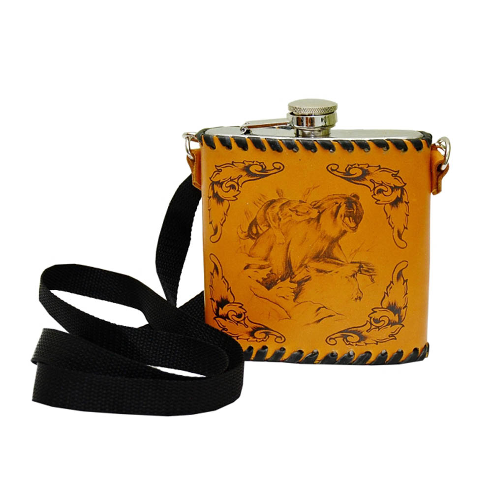 Поэтому походная фляга в кожаном чехле - хороший и нужный подарок для мужчины. Кожа - натуральный материал, который помогает сохранить тепло, придает подарку солидность. Кожа красива и приятна на ощупь, а кроме того, есть множество способов ее украшения - отделка края, нанесение орнамента, гравировка или художественное выжигание. Например, дикий медведь любителю охоты. Изюминка заключается в том, что изображение на кожаном чехле может быть индивидуальным - с дарственной надписью, портретом юбиляра или фотографией его любимой собаки. А ремешок делает удобной переноску столь полезного и красивого подарка.