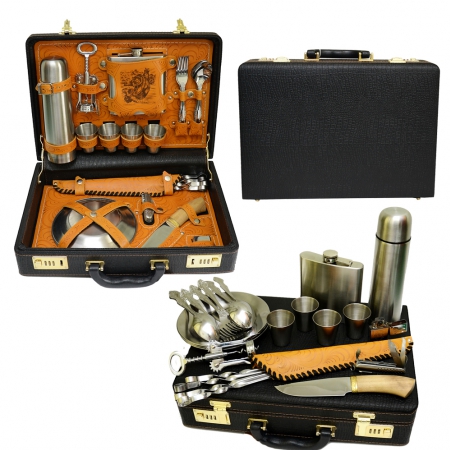 Дипломат из искусственной кожи включает в себя некоторые приятные мелочи, которые могут пригодиться в пути. Например, термос для горячего чая и фляжку для алкоголя с набором рюмок на 4 персоны. Почему нет? Такой набор может пригодиться в пути с друзьями на природу, когда вы в пятницу вечером едете с палатками в сторону красивых и более менее диких мест.