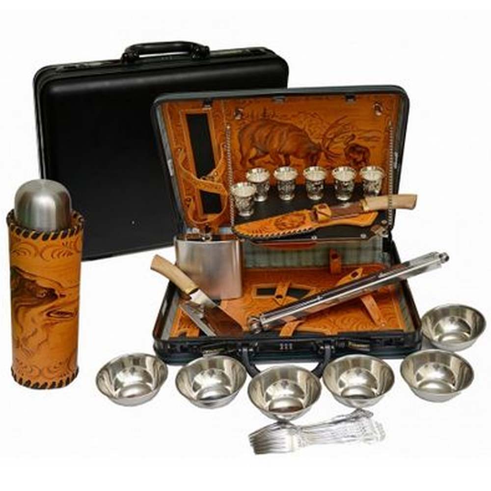 Встроенная откидная полка позволит выпить и закусить даже "на коленке". Все продумано и предусмотрено: каждая деталь прочно зафиксирована на своем месте, и при сборе набора сложно что-либо забыть - пустое место сразу бросится в глаза.