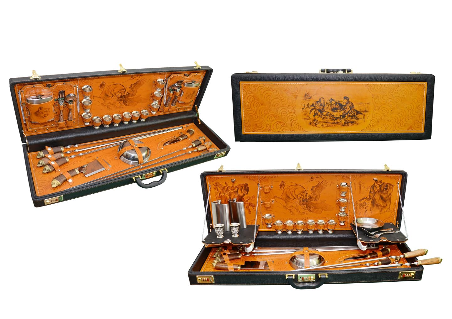 Встроенные откидные полки позволят выпить и закусить даже "на коленке". Все продумано и предусмотрено: каждая деталь прочно зафиксирована на своем месте, и при сборе набора сложно что-либо забыть - пустое место сразу бросится в глаза.