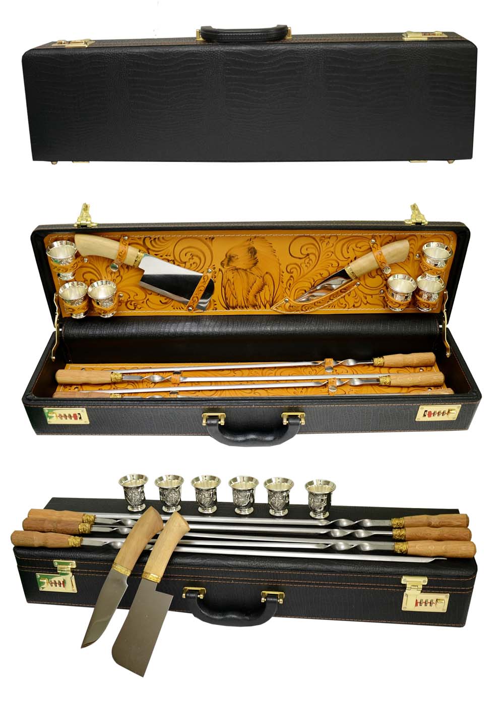 Черный дипломат на кодовых замках предполагает, что внутри находится что-то очень важное. Если не миллион долларов, то хотя бы ценные документы. В этом подарочном наборе вы обнаружите кое-что не менее важное, чем документы - набор для приятного времяпровождения. Стопки на 6 персон - не хватает только закуски. Закуску придется взять отдельно, порубить и поджарить на прилагаемых шампурах.