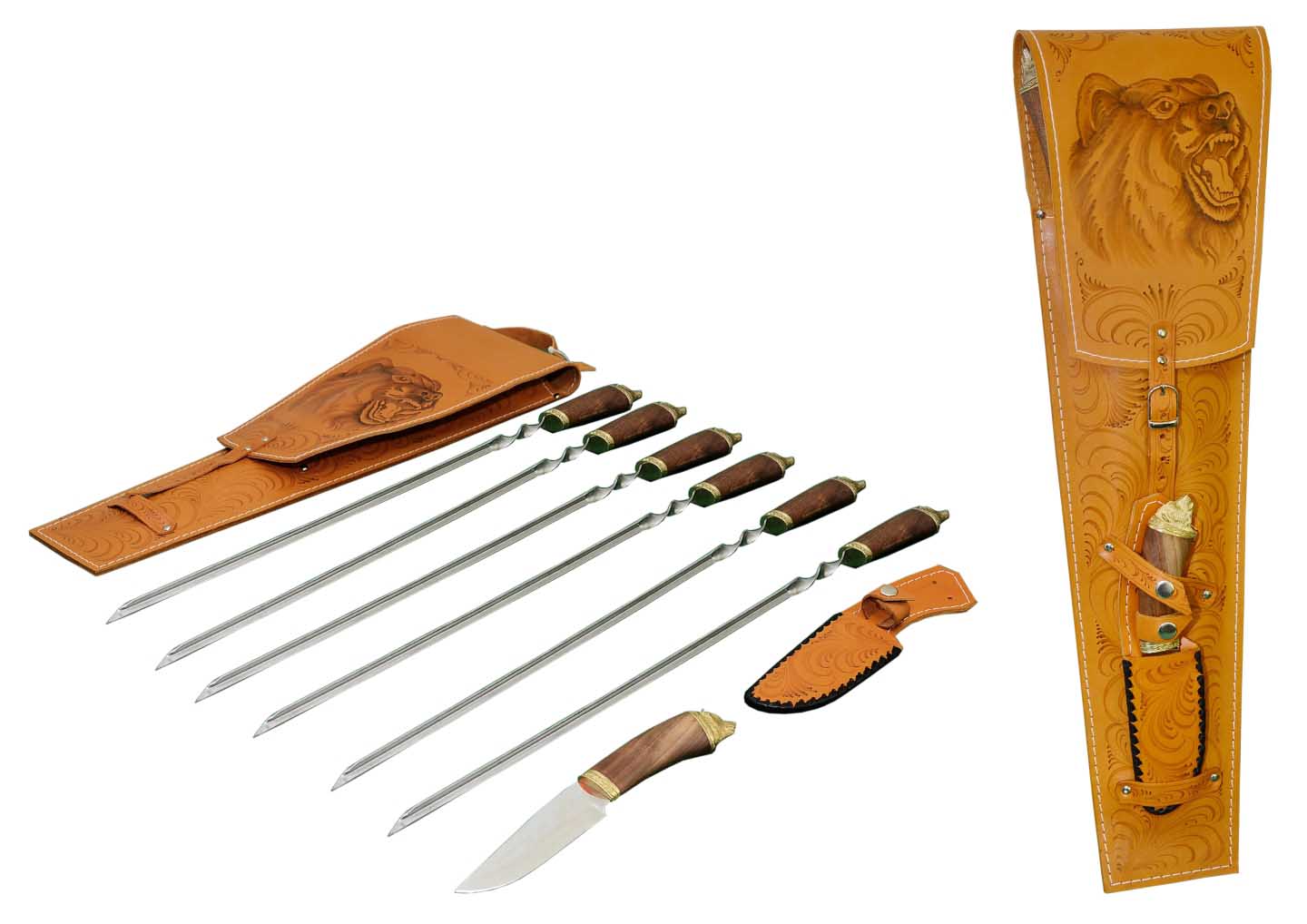 Аккуратный и стильный кожаный футляр при желании может стать уникальным: орнамент на ваш вкус, мотивы природы, дикие звери: волки, олени. Или ваше изображение, которое придаст подарочному набору для шашлыка неповторимость: портрет хозяина шампуров, дарственная надпись, фотография с последней удачной охоты или изображение любимого места у реки сделают вещь бесценной.